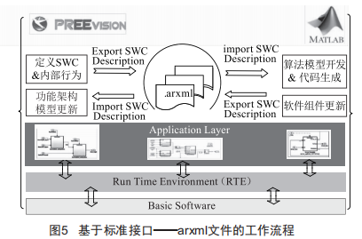 通過Simulink生成的AUTOSAR描述文件,反過來,也可以重新導(dǎo)入至PREEviSiOn中從而將軟件開發(fā)人員在Simulink中對軟件組件做出的修改同步到PREEviSiOn中完善功能架構(gòu)模型。二者之間的數(shù)據(jù)傳遞交互過程如圖5所示。