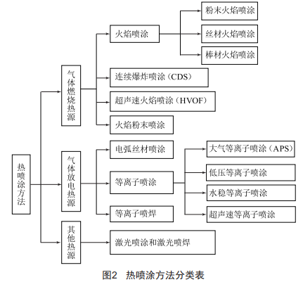 (4)噴涂操作程序簡單,效率高,施工時間短,成本較低。熱噴涂方法一般可按照其熱源類型進行分類,在此基礎(chǔ)上再按照不同形式的涂層材料形成一系列的熱噴涂方法,如圖2所示。