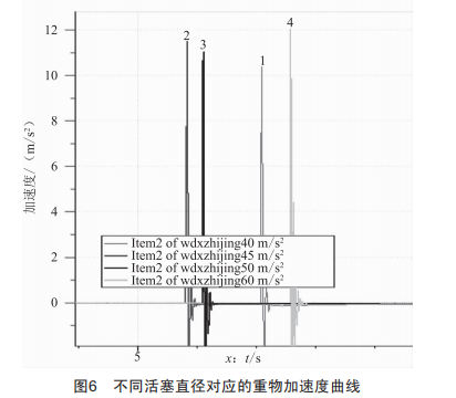 不同活塞直徑對應的重物加速度曲線如圖6所示。圖中曲線l、2、3、4分別對應液壓缸活塞直徑為40mm、45mm、50mm、60mm時重物的位移曲線。由分析可知,當液壓缸活塞直徑為40mm時系統(tǒng)的穩(wěn)定性較好。