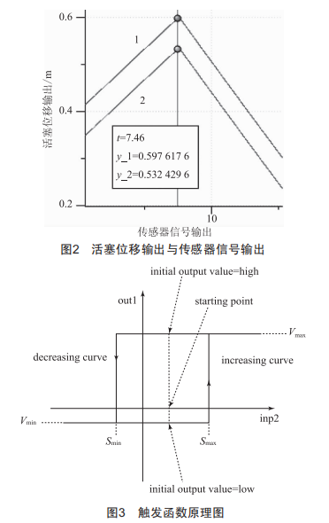 如圖3所示為元件4觸發(fā)函數(shù)模塊的作用原理圖,只有輸入信號在Vma.與Vmix之間時觸發(fā)函數(shù)才會起作用,當達到Vma.值時會輸出一個高的信號值,當達到Vmix值時會輸出一個低的信號值,本文設定低閾值為0+3m,高閾值為0+6m。元件4觸發(fā)函數(shù)通過將不同的電信號輸入電磁閥從而控制活塞桿只會在位移0.3~0.6m內進行往復循環(huán)運動。