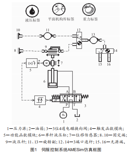 本系統(tǒng)包含液壓缸、電磁換向閥等元件,所以必須要用液壓庫:本系統(tǒng)包含較鏈、懸臂等元件,所以必須要用平面機構庫:本系統(tǒng)需要懸掛重物,所以需要進行重力模擬。伺服液壓機械臂系統(tǒng)的整體仿真草圖如圖1所示。