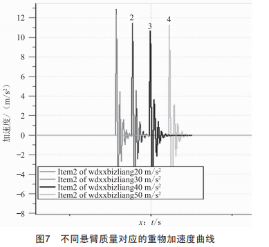 不同懸臂質量對應的重物加速度曲線如圖7所示。圖中曲線1、2、3、4分別對應懸臂質量為20kg、30kg、40kg、50kg時重物的位移曲線。由分析可知,當懸臂質量為40kg時系統(tǒng)的穩(wěn)定性較好。