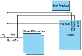 LTC2971能夠檢測(cè)60V電源軌上的輸入電源電流。IIN_SNS引腳可以直接連到電源輸入上的檢測(cè)電阻。對(duì)于24V以上的電源電壓,建議使用降壓穩(wěn)壓器通過(guò)VPWR引腳為L(zhǎng)TC2971供電,這樣可節(jié)省功率并避免LTC2971自發(fā)熱。由于VPWR × IPWR會(huì)產(chǎn)生功耗,可能導(dǎo)致芯片溫度升高到預(yù)期以上。ADP2360具有一個(gè)固定5 V選項(xiàng),可為降壓穩(wěn)壓器提供低成本、小尺寸的解決方案。