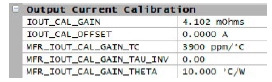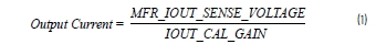 用于將電壓轉(zhuǎn)換為電流的PMBus命令稱(chēng)為IOUT_CAL_GAIN。這是分流電阻的標(biāo)稱(chēng)電阻。芯片通過(guò)ISENSE引腳測(cè)量分流電阻上的小電壓降,在內(nèi)部執(zhí)行轉(zhuǎn)換,并使用READ_IOUT命令返回輸出電流。芯片檢測(cè)到的實(shí)際電壓可通過(guò)MFR_IOUT_SENSE_VOLTAGE命令獲得。芯片使用以下公式計(jì)算輸出電流:
