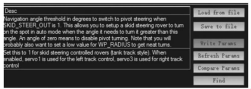 依次單擊"配置調(diào)試"和FullParameterList,系統(tǒng)會(huì)自動(dòng)彈出基本調(diào)試界面,如圖3(a)所示,并單擊"0K"按鈕:單擊界面右半部分的"Find"按鈕,系統(tǒng)會(huì)自動(dòng)彈出對(duì)話框,輸入"SKIDSTEER0UT",如圖3(b)所示:單擊"0K"按鈕進(jìn)行參數(shù)搜索操作,將"SKIDSTEER0UT"設(shè)置為l,如圖3(c)所示,也就是將機(jī)器人的轉(zhuǎn)彎方式更改為差速轉(zhuǎn)彎:最后單擊界面右半部分的"writeParam"按鈕,將數(shù)據(jù)寫入系統(tǒng),如圖3(d)所示。