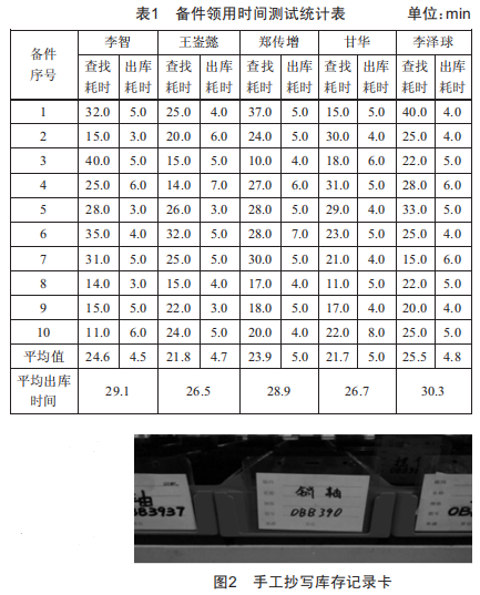 從測試結(jié)果可以看出,平均備件領(lǐng)用耗時約為27+8,mi,大部分時間花費在了備件查找上,備件查找平均耗時為22+5,mi,占比81.,備件出庫耗時為5.%,mi,占比13.,傳統(tǒng)管理模式導(dǎo)致備件查找時間過長。