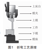 折彎工藝原理如圖1所示,將上、下模分別固定于折床的上、下工作臺上,利用馬達產生的動力驅動工作臺相對運動,結合上、下模形狀,從而實現(xiàn)對板材的折彎成型。
