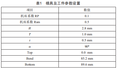 按照設計的方案,采用折床小松PAs5020與機器人FANUC-R2000ic/165F,工件展開尺寸為1052.8mm×993.8mm×1.0mm,折彎角度為90a,折彎尺寸為(9.0±0.25)mm、(15.0±0.25)mm、(21.0士0.25)mm,使用上模為GZJ3090、下模為GV59060進行方案驗證。機器人運行的點位通過人工校對完成,模具及工件參數(shù)設置如表1所示。