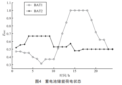 圖3所示為DG在不同時(shí)段下的功率輸出情況,圖中PV和wT受不同時(shí)段的出力限制,MT為全功率輸出。圖4所示為蓄電池在一天24個(gè)時(shí)段的荷電狀態(tài)分布,兩個(gè)蓄電池相互協(xié)調(diào),在負(fù)荷較重時(shí)放電,在負(fù)荷較輕、間歇性能源充足時(shí)充電。結(jié)合圖3和圖4分析可知,蓄電池儲能根據(jù)主動(dòng)配電網(wǎng)中的負(fù)荷需求及DG的出力大小做出充電/放電響應(yīng)。