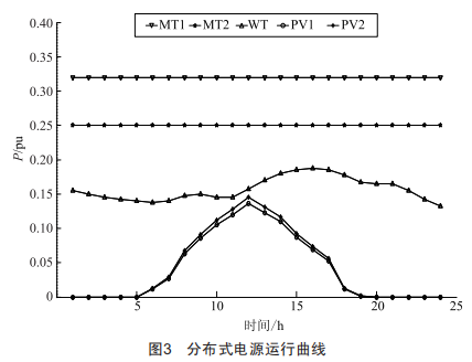 主動(dòng)配電網(wǎng)能對于小幅度的負(fù)荷及間歇式功率波動(dòng)做出實(shí)時(shí)響應(yīng),以修正實(shí)際負(fù)荷曲線及間歇式能源發(fā)電出力曲線與預(yù)測曲線的偏差,緩解功率波動(dòng)。本文采用的間歇性DG為wT和PV,利用微型柴油發(fā)電機(jī)(MicroTurbine,MT)配合以平滑間歇性分布式電源的功率波動(dòng),減少配電網(wǎng)中的缺供電量。