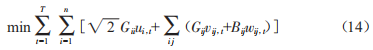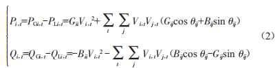 式中,PGi,t,0Gi,t為DG在時(shí)段t節(jié)點(diǎn)i的有功功率;PLi,t,0Li,t為時(shí)段t節(jié)點(diǎn)i的負(fù)荷需求;vi,t為時(shí)段t節(jié)點(diǎn)i的電壓水平;Gij、Bij、9ij為系統(tǒng)拓?fù)鋮?shù)。