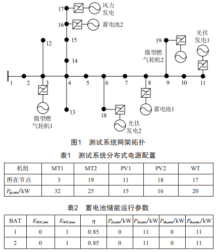 利用運(yùn)籌學(xué)建模求解軟件GAMs,搭建本文所提的MI0CP模型。以修改后的西門子Benchmark低壓系統(tǒng)作為本文的測試系統(tǒng),其額定電壓為0.4kV,額定基準(zhǔn)容量為100kVA。配置的DG如圖1所示,以日前24h作為算例的求解時(shí)間區(qū)間,測試系統(tǒng)的電源參數(shù)如表1、表2所示。