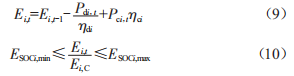式中,Ei,4為節(jié)點(diǎn)i的蓄電池時(shí)段4的電量:Ei,C為節(jié)點(diǎn)i的蓄電池的額定容量:nci和ndi分別為蓄電池的充放電效率:EsoCi,min和EsoCi,max分別為蓄電池荷電狀態(tài)的上下限值。