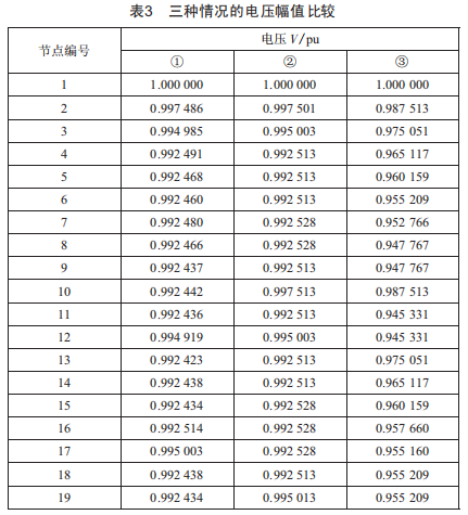 如表3所示,①列表示利用二階錐優(yōu)化模型求解的電壓分布:②列表示將首節(jié)點(diǎn)作為松弛節(jié)點(diǎn),DG接入的節(jié)點(diǎn)作為恒功率輸入節(jié)點(diǎn)求解得到的電壓分布:③列表示DG并未接入配電網(wǎng)中,系統(tǒng)中的負(fù)荷是通過首節(jié)點(diǎn)所連主網(wǎng)輸送計(jì)算得到的電壓分布。對比①和②列,最大偏差量為0.00094??梢?二階錐優(yōu)化能夠準(zhǔn)確實(shí)現(xiàn)潮流求解。對比①、②和③可知,通過DG接入配電網(wǎng),能就近將電能提供給負(fù)荷,減少由于長距離功率輸送引起的電壓降,提高了電壓水平,改善了電能質(zhì)量。