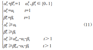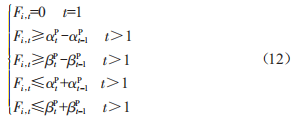 為了進(jìn)一步表示蓄電池的狀態(tài)轉(zhuǎn)換過程,引入0-l變量Fi,4以記錄蓄電池的充放電過程切換,即當(dāng)且僅當(dāng)aEQ \* jc3 \* hps10 \o\al(\s\up 3(l=l、aEQ \* jc3 \* hps10 \o\al(\s\up 3(=0或者aEQ \* jc3 \* hps10 \o\al(\s\up 3(l=0、aEQ \* jc3 \* hps10 \o\al(\s\up 3(=l時(shí),蓄電池才發(fā)生充放電過程的切換,則Fi,4滿足以下約束條件: