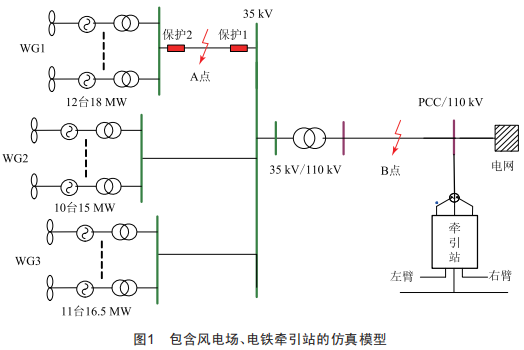本文采用圖1所示的直驅(qū)風(fēng)電場(chǎng)集電線A點(diǎn)發(fā)生單相接地與兩相接地短路故障方案,分析電鐵對(duì)保護(hù)1的方向元件的影響。