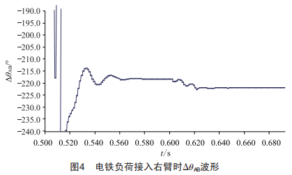 由圖3可知,當(dāng)電鐵在0.6s經(jīng)過時(shí),相角差會(huì)受到影響(圖中趨勢(shì)為角度增大,此時(shí)電鐵接入供電臂左臂),當(dāng)負(fù)荷接入右臂時(shí),由電氣化鐵路輪流換相原理可知,相位差將減小,如圖4所示。