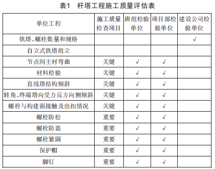 首先需要建立并在實(shí)踐中逐漸完善現(xiàn)場(chǎng)施工材料的檢測(cè)和使用制度,防止劣質(zhì)施工材料進(jìn)入施工場(chǎng)地,防止施工材料被盜取、破壞等。另外,建立完善的施工過(guò)程控制制度,嚴(yán)格控制施工過(guò)程,以提升輸電線路的施工質(zhì)量。然而,目前部分施工單位并沒(méi)有建立完善的施工過(guò)程控制制度,在控制施工質(zhì)量時(shí)沒(méi)有依據(jù)可尋,出現(xiàn)施工質(zhì)量問(wèn)題后也沒(méi)有對(duì)應(yīng)的規(guī)章制度進(jìn)行問(wèn)題追責(zé)。因此,施工單位應(yīng)該結(jié)合自身情況建立對(duì)應(yīng)的輸電線路施工質(zhì)量控制規(guī)章制度,還非常有必要組建專門(mén)的施工質(zhì)量控制小組,嚴(yán)格貫徹落實(shí)制定的規(guī)章制度。根據(jù)具體工程情況,制定有針對(duì)性的施工質(zhì)量檢測(cè)評(píng)估表格,表1、表2為部分輸電線路施工過(guò)程中的質(zhì)量評(píng)估表格,可以基于這些表格定期或者不定期地針對(duì)施工質(zhì)量開(kāi)展檢測(cè)工作。如果在檢查過(guò)程中發(fā)現(xiàn)存在質(zhì)量問(wèn)題,一方面及時(shí)往上通報(bào)情況,對(duì)相關(guān)責(zé)任人員進(jìn)行處罰,另一方面,及時(shí)采取有效措施解決問(wèn)題,以提升工程項(xiàng)目施工質(zhì)量。對(duì)于在檢查過(guò)程中表現(xiàn)較好的班組和個(gè)人進(jìn)行物質(zhì)和精神上的獎(jiǎng)勵(lì),通過(guò)這種獎(jiǎng)勵(lì)和懲罰措施可以激勵(lì)員工的工作積極性和責(zé)任心,提升他們的安全意識(shí),盡可能避免由于人為因素造成的施工質(zhì)量問(wèn)題。