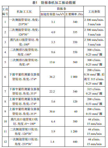 機(jī)加工振動(dòng)測(cè)試共分12個(gè)工況進(jìn)行,防振條振動(dòng)測(cè)試結(jié)果如表1所示。測(cè)試結(jié)果顯示:不同的機(jī)加工工況,防振條測(cè)得的最大瞬時(shí)加速度變化較大,其主要頻率成分也不盡相同。防振條加速度最大值出現(xiàn)在蒸汽發(fā)生器下部窄量程測(cè)量?jī)x器接管銑切加工時(shí),最大瞬時(shí)加速度為36.2m/s2,對(duì)應(yīng)主要頻率為1000Hz,方向?yàn)槠叫杏趽Q熱管方向,滿(mǎn)足蒸汽發(fā)生器防振條振動(dòng)幅值要求,未對(duì)防振條產(chǎn)生偏移影響。
