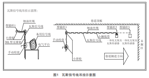 在滑輪的出口處預(yù)留夠拉緊細油絲繩的位置,開始把瓦斯信號線與細油絲繩使用小型捆線帶每隔300mm拉緊并捆扎一處,一直捆扎到細油絲繩距離掘進工作面迎頭的一端,剩下的備用瓦斯信號線盤放在用于吊掛瓦斯傳感器的一體化支架上。絞動手動絞盤,拉緊細油絲繩,隨著細油絲繩的拉緊,附著在細油絲繩上的瓦斯信號線也一并拉起并成一條直線。