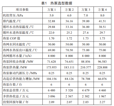 該機組背壓分別為5.0kPa、6.0kPa、7.0kPa和8.0kPa時,根據(jù)這4組參數(shù)選取熱泵,熱泵選型數(shù)據(jù)如表1所示。
