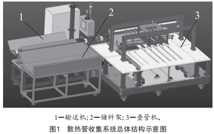 該收集系統(tǒng)是針對(duì)汽車發(fā)動(dòng)機(jī)散熱器中散熱管的收集專門(mén)研發(fā),可實(shí)現(xiàn)多種管型的自動(dòng)化收集,主要工作部分包括輸送機(jī)、儲(chǔ)料架、疊管機(jī)3部分,總體結(jié)構(gòu)如圖1所示。