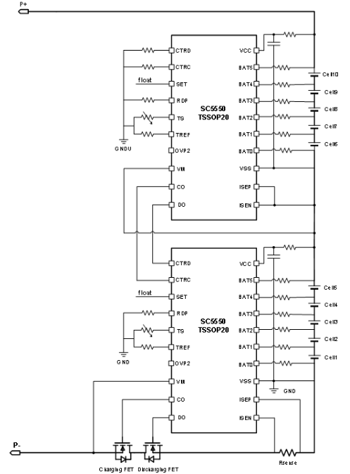 如有高壓高功率需求,需要用到6節(jié)以上串聯(lián)電池,SC5550支持可堆疊設(shè)計(jì),單顆SC5550支持2~5串電池,通過2~3顆SC5550 堆疊,將可支持的串?dāng)?shù)拓展到6~15S。