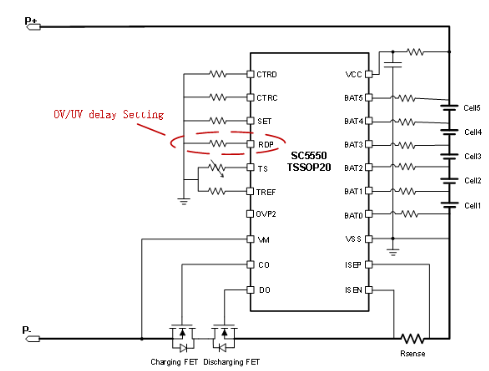 SC5550支持充電過壓保護(hù)OVP(保護(hù)點(diǎn)從3.0 V 到4.575V可選)、放電欠壓保護(hù)UVP(保護(hù)點(diǎn)從1.2V到3.0V可選),涵蓋磷酸鐵鋰、鋰離子/鋰聚合物等多種鋰電池。此外,SC5550的OVP和UVP保護(hù)檢測(cè)延時(shí)可以通過專用管腳RDP電阻進(jìn)行配置,支持用戶靈活配置保護(hù)延時(shí)參數(shù)。