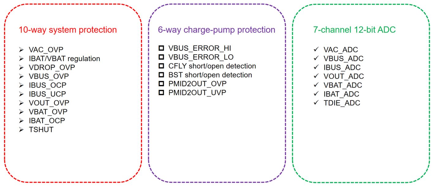 SC8546 內(nèi)部集成多達(dá) 16 重安全防護措施和 7 路 12-bit ADC,為用戶的充電安全保駕護航。
