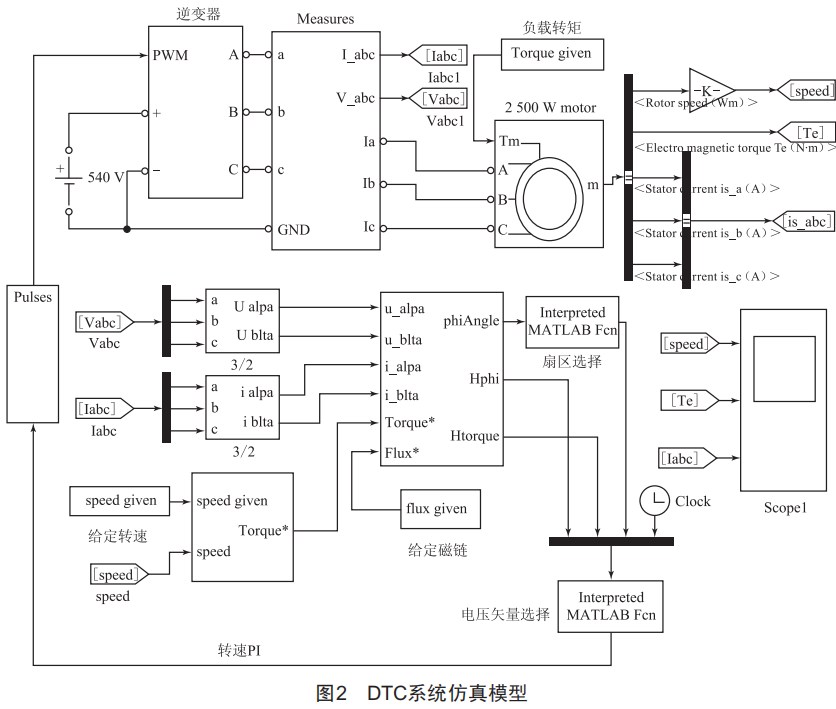 Matlab/Simulink是一個(gè)交互式的動(dòng)態(tài)系統(tǒng)建模、仿真、分析集成環(huán)境,并帶有豐富的功能模塊。在其中搭建異步電機(jī)DTC系統(tǒng)仿真模型,仿真模型整體如圖2所示。