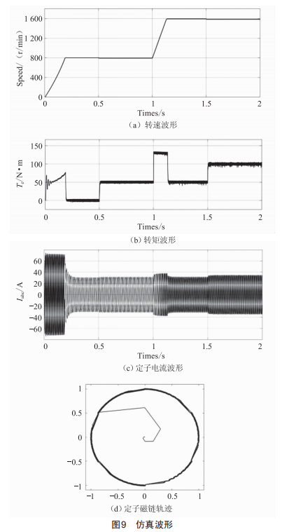從圖9(a)和(b)轉(zhuǎn)速和轉(zhuǎn)矩的仿真波形可以看出,直接轉(zhuǎn)矩控制對(duì)轉(zhuǎn)速和轉(zhuǎn)矩的突變均有很快的響應(yīng)速度,有較好的穩(wěn)態(tài)性能,且超調(diào)量較小。DTC系統(tǒng)在1s開(kāi)始從800r/min加速到1600r/min過(guò)程中,能夠輸出設(shè)定的最大轉(zhuǎn)矩限值,實(shí)現(xiàn)轉(zhuǎn)速的最快調(diào)節(jié)。圖9(c)定子電流波形表明,DTC系統(tǒng)在穩(wěn)定運(yùn)行時(shí)電流基本保持為正弦波,并且在突加負(fù)載時(shí)無(wú)過(guò)流現(xiàn)象。圖9(d)表明定子磁鏈幅值在動(dòng)態(tài)加速和穩(wěn)態(tài)運(yùn)行時(shí),都能基本保持恒定幅值1,在磁鏈滯環(huán)容差范圍內(nèi)波動(dòng),磁鏈軌跡接近圓形。
