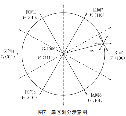 逆變器三組橋臂分別接電機(jī)A、B、C三相,上下橋臂互補(bǔ)導(dǎo)通可以組合出8種電壓矢量,其中V0和V7是零電壓矢量,V1~V6為有效電壓矢量。以每個(gè)有效電壓矢量為矢量中線,將定子磁鏈空間復(fù)平面分為6個(gè)扇區(qū),每個(gè)扇區(qū)所在區(qū)間為60o電角度,如圖7所示。