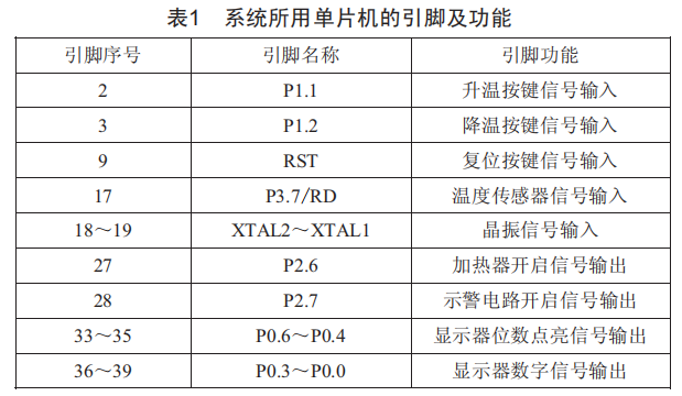 智能魚缸采用的核心控制芯片為AT89C52單片機(jī),該型號的單片機(jī)具有成本低廉、性能可靠和兼容性好等優(yōu)點(diǎn),在市場上得到了廣泛應(yīng)用。其內(nèi)部集成8kB的RoM空間,足夠支持智能魚缸系統(tǒng)的程序編寫,并且提供40個引腳與外部電路相連,滿足系統(tǒng)性能的擴(kuò)展需求。本次設(shè)計(jì)中涉及到的單片機(jī)主要引腳及其功能如表1所示。