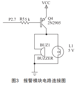 本設(shè)計(jì)采用的報(bào)警電路如圖3所示,主要由三極管、蜂鳴器和指示燈組成。當(dāng)溫度傳感器檢測到溫度超出10~30℃的區(qū)間時(shí),單片機(jī)I/o口輸出電流,在上拉電阻的作用下使三極管導(dǎo)通,蜂鳴器和指示燈得電示警。