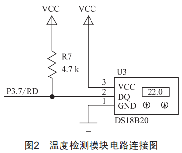 智能魚缸采用的溫度檢測傳感器為Ds18B20溫度傳感器。該型號的溫度傳感器采用導(dǎo)熱性高的密封膠灌封,因而具有靈敏度高和延遲度小等優(yōu)點(diǎn),同時(shí)其測量溫度范圍較大(-55~+125℃),滿足系統(tǒng)功能需求。由于Ds18B20采用了"1-wire"單線技術(shù)(即在1根I/o線上讀寫數(shù)據(jù)),因此傳感器與外部電路的連接較為簡單(圖2),但同時(shí)也對讀寫的數(shù)據(jù)位提出了嚴(yán)格的時(shí)序要求。