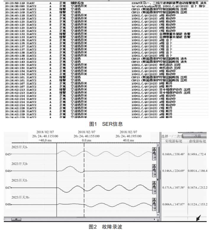 從sER來看,2023遠方合閘命令發(fā)出后到三相不一致跳開2023斷路器期間,無運行人員操作、測控及保護動作信息,如圖1、圖2所示,2023開關(guān)B相無故跳開。