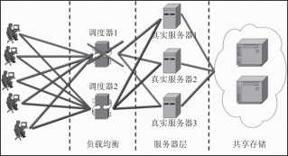 如圖1所示,用戶通過網(wǎng)絡(luò)訪問服務(wù)器時(shí),通過"負(fù)載均衡器"分配每一個(gè)用戶訪問的具體服務(wù)器,從而分?jǐn)倲?shù)量龐大的訪問請求量,提升用戶體驗(yàn)和訪問效率。