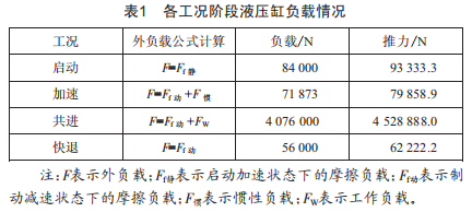 壓濾機(jī)液壓系統(tǒng)在遭受外界負(fù)載影響時(shí),各工況液壓缸負(fù)載情況如表1所示。