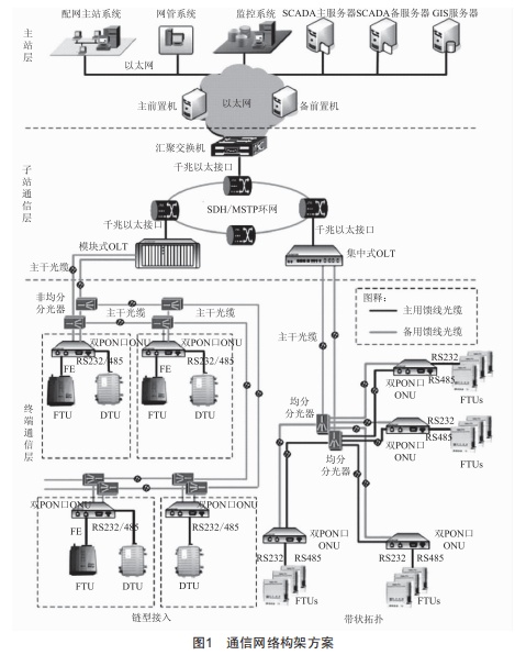 終端等通層的網(wǎng)絡(luò)結(jié)構(gòu)采用"手拉手"的等通信方 ,如圖1所示 ,0LT1和0LT2分別安裝在不同的110 kV變電所 ,0NU設(shè)備安裝在配電終端處 。 由于0NU設(shè)備選擇接入不同的0LT , 在光纜中斷或0LT設(shè)備失效時(shí)均能實(shí)現(xiàn)保護(hù) 。當(dāng)因配電一次網(wǎng)架的原因不滿足兩點(diǎn)接入不同的變電所條件時(shí) , 能夠組織兩條不同的光路 ,保證單點(diǎn)能夠接入其中一個(gè)變電站。終端等通層與主站層之間采用千兆以太網(wǎng)進(jìn)行將據(jù)傳輸 。主站層的SCADA服務(wù)器式能夠切實(shí)反映配電設(shè)備的工作狀態(tài)。