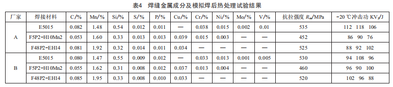 兩家焊材廠家反饋焊縫金屬成分及模擬焊后熱處理結(jié)果,如表4所示。