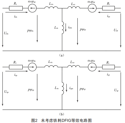 不考慮電機(jī)鐵耗,雙饋異步電機(jī)的等效電路如圖2所示,(a)為d軸電路,(b)為u軸電路,大多數(shù)雙饋系統(tǒng)的研究都采用了圖2所示的等效電路模型,其能基本反映雙饋電機(jī)的特征,但在一些對(duì)功率、效率研究較精確的場(chǎng)合則不適用,此時(shí)便需要考慮電機(jī)的損耗,特別是鐵耗。