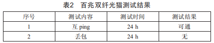 航管樓測(cè)試終端配置1P地址:192.168.1.2,子網(wǎng)掩碼:255.255.255.0:西區(qū)綜合業(yè)務(wù)樓測(cè)試終端配置1P地址:192.168.1.1,子網(wǎng)掩碼:255.255.255.0。通過兩終端對(duì)ping的方式對(duì)本組網(wǎng)的以太網(wǎng)業(yè)務(wù)進(jìn)行測(cè)試,組網(wǎng)及測(cè)試結(jié)果如表2所示。
