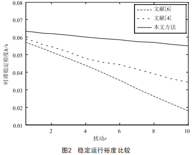 根據(jù)本文的定理,求出不同勵磁擾動在r滿足約束條件0<h(t)<h時,系統(tǒng)的穩(wěn)定裕度隨r的增大而減小,并與文獻[6]和文獻[4]的數(shù)值進行了對比,如表1和圖2所示,從而體現(xiàn)出了本文方法的可行性。