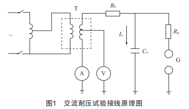 交流耐壓試驗接線原理圖如圖l所示。其中,Cx為被試驗設(shè)備容抗,Rb/Rq為保護(hù)電阻,G為保護(hù)球隙,Ic為被試驗設(shè)備電容電流,T為試驗變壓器,A為電流表,V為電壓表。