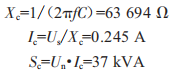 式中,Xc為容抗(0):m取3.14:f為交流電頻率,取50Hz:C為電容,為0.05uF,本計算式取C值為5×10-8F:Ic為電容電流(A):Us為試驗電壓,取15.6kV:Un為額定電壓,取150kV:sc為試驗變壓器容量(kVA)。