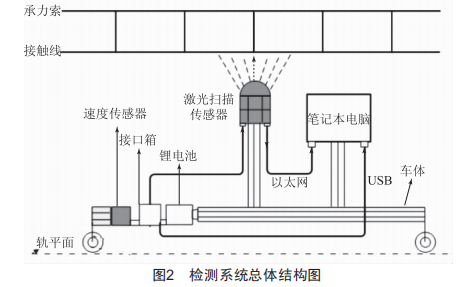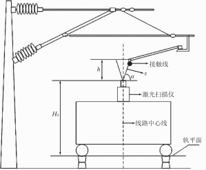 非接觸式檢測方法分為基于激光掃描的測量、基于超聲波原理的測量以及基于圖像處理的測量。其中,基于超聲波原理的非接觸式檢測方案中,超聲波受到溫度、濕度以及大氣壓等環(huán)境因素對檢測結果的影響較大,設備老化程度較快:基于圖像處理的非接觸式檢測方案中,對攝像元件和高壓隔離電路的絕緣要求高,且有效信息提取、處理的算法復雜。相對前兩者而言,基于激光掃描檢測的方案受影響因素更小,在實際應用中,算法相對成熟可行。為了方便接觸網工作業(yè),本文從國內外接觸網幾何參數(shù)的眾多檢測方案中,優(yōu)先選擇基于激光掃描處理的非接觸式檢測方案來設計接觸網檢測系統(tǒng)。