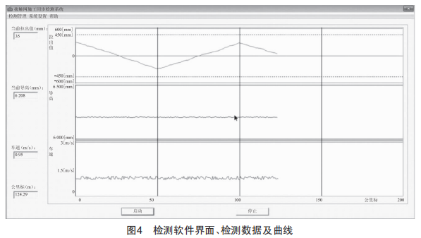 該裝置系統(tǒng)軟件層的通信采用接口通過數(shù)據(jù)線與裝有windows系統(tǒng)的筆記本電腦進行連接并接收,其功能分為以下幾部分:(1)初始掃描參數(shù)設置:(2)實時數(shù)據(jù)顯示:(3)動態(tài)圖像繪制:(4)數(shù)據(jù)保存于數(shù)據(jù)庫中便于讀取、處理。在系統(tǒng)開始工作前,可以設定初始參數(shù),包括激光源離軌道平面距離、激光掃描范圍、公里標初始值、數(shù)據(jù)采集間隔、激光源距離接觸線的縱向距離等。通過設定以上數(shù)據(jù),可以減少一些冗雜數(shù)據(jù),為使數(shù)據(jù)更加精確,在繪圖時采用取平均值的方法使誤差進一步減小,最后以公里標為基量繪制出導高、拉出值、速度,并實時顯示所測得數(shù)據(jù),如圖4所示。