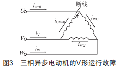 當(dāng)三相異步電動機(jī)聯(lián)結(jié)的定子繞組中某一相繞組斷裂后,剩余的兩相繞組就以V形聯(lián)結(jié)的方式連接,如圖3所示。由于處于V形連接的三相異步電動機(jī)僅有兩相繞組能夠正常工作,其功率就會不同程度地降低。當(dāng)電動機(jī)承受的負(fù)荷較大時(shí),其轉(zhuǎn)速就會隨之降低,并且定子中的電流也會超過其額定電流,而電動機(jī)會出現(xiàn)溫度異常升高和振動現(xiàn)象,影響其正常運(yùn)行。