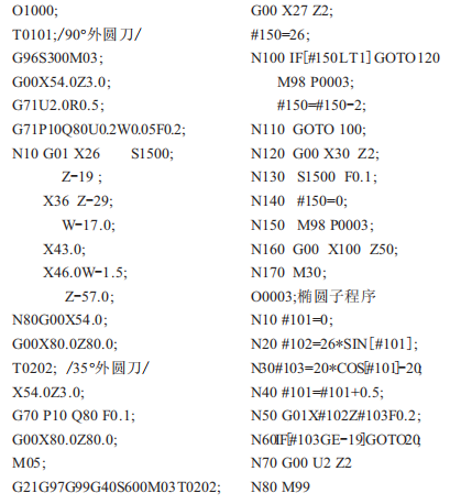 按照上面的工藝路線分析和編程思路,實(shí)際編寫(xiě)橢圓軸的橢圓輪廓部分的加工程序。