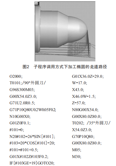 對(duì)比圖2與圖3橢圓加工的走刀軌跡可以看出,利用宏程序作為子程序調(diào)用的編程方法加工橢圓,存在嚴(yán)重的空走刀現(xiàn)象:而采用G71(粗車復(fù)合循環(huán))指令和宏程序相結(jié)合的方法加工橢圓,加工效率明顯提高,刀具沒(méi)有空切削加工行程,加工工藝合理,工時(shí)短,程序語(yǔ)句少,不存在嵌套的循環(huán)宏程序,易于程序檢查。